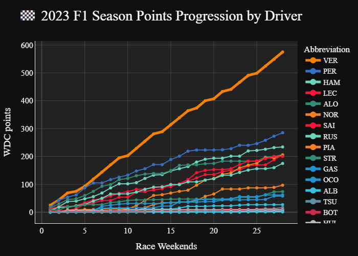 title="🏁 2023 F1 Season Points Progression by Driver",